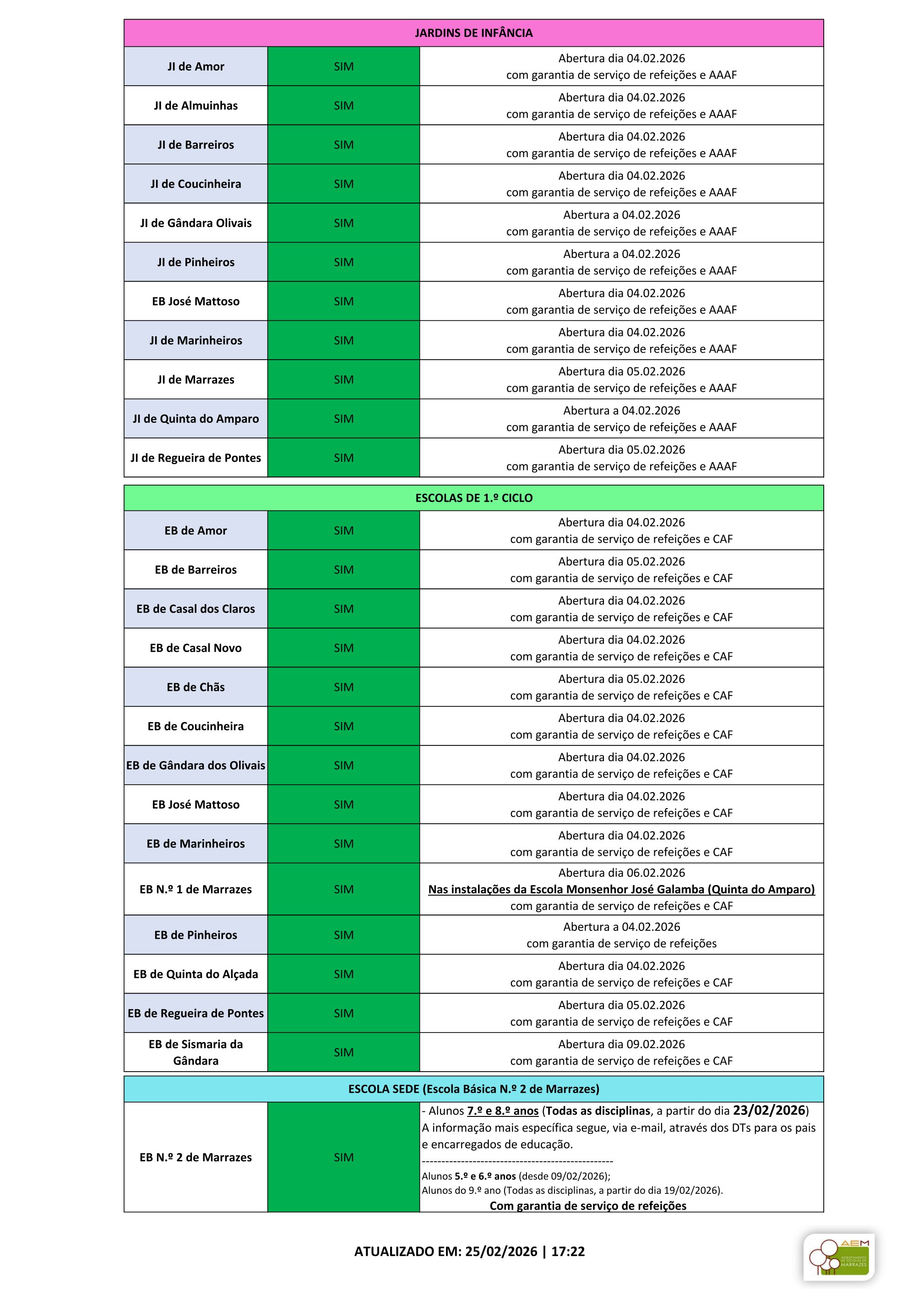 Estabelecimentos de educação e ensino do Agrupamento com condições de funcionamento - Informação de reabertura (Atualizado em 25/02/2026 - 17:22h)